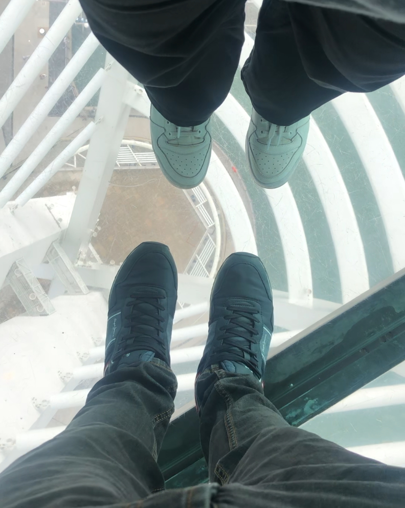 - Oh shit we gotta go! We’re off to Spinnaker Tower. Oh shit I didn’t realise you’re scared of heights – well, too bad – stand on this glass panel. (refer to you being adorable on the left).